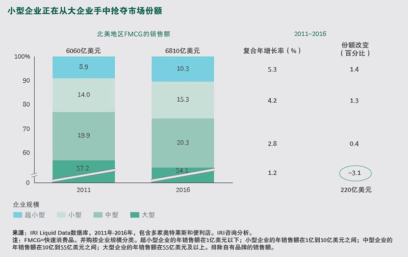 過去50年,跨國消費品企業強化品牌、擴展產品組合、穩步提高市場占有率和收入,創造了強大的股東價值。那曾是大媒體、大零售商、大品牌的時代。大約五年前,規模較小的企業和品牌首次開始瓜分大品牌的蛋糕。在2011年到2016年間,北美地區大約220億美元的行業銷售從大企業轉移到小企業。歐洲也經歷了同樣的改變。