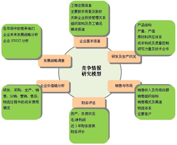 競爭情報研究是關于競爭環境、競爭對手和競爭策略的調查研究,是根據客戶的要求,通過合法手段,針對特定行業的競爭對手企業或潛在競爭情況進行的調研。競爭情報研究是一種系統的、合法的研究活動;是一種產品和服務,研究關注的重點是企業外部那些影響企業戰略和策略決策的因素。